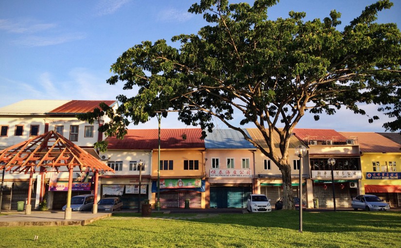 During golden hour, the bold colours of these storefronts in Kuching, Malaysia are on full display.